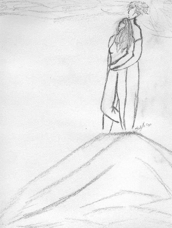 She is feeling comfort in his arms, but he's not lost in the moment. He keeps thoughts of deceit on his mind. He will betray her.